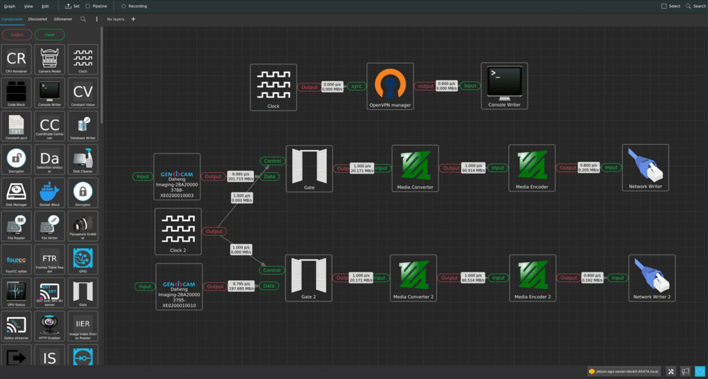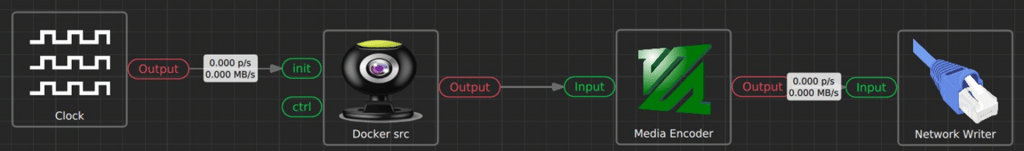 For the designer, there is no difference between adding a physical camera or a Docker container to the pipeline. This allows one to discuss concepts such as networking (“I would like my data to be sent over there”) with disregard of the underlying technology (TCP/UDP/unicast/multicast).